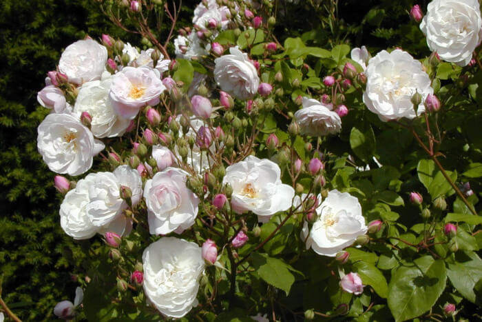 Polyantha roses are low-maintenance, hardy, and covered with clusters of small blooms from spring to fall. Their flowers are usually white, pink, or red and appear in abundance throughout the season.