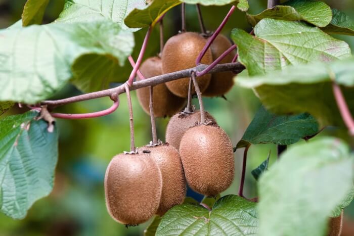 Hardy kiwi vines handle both full sun and partial shade. They need a sturdy trellis or arbor for support as they grow vigorously.
