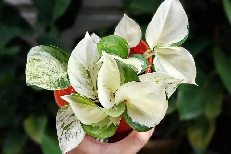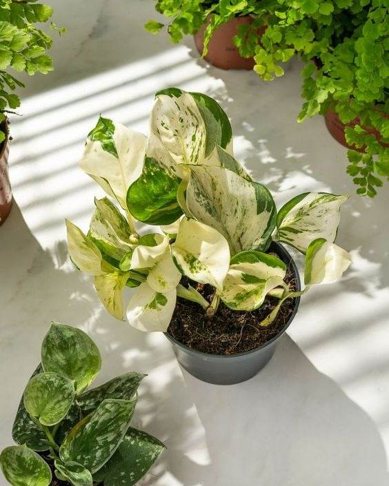 Snow queen pothos is a striking variety of pothos with green and white variegated leaves. Due to the small amount of green on its leaves, you should place it in a location that receives bright and indirect light.