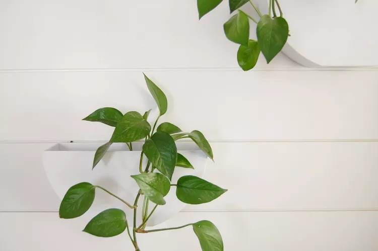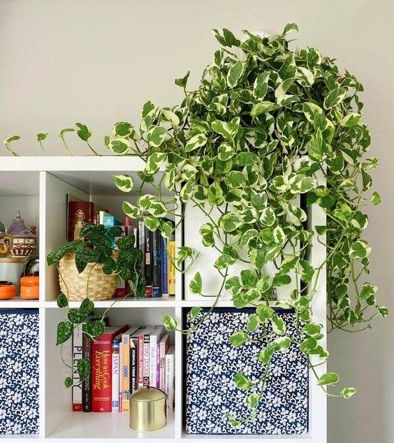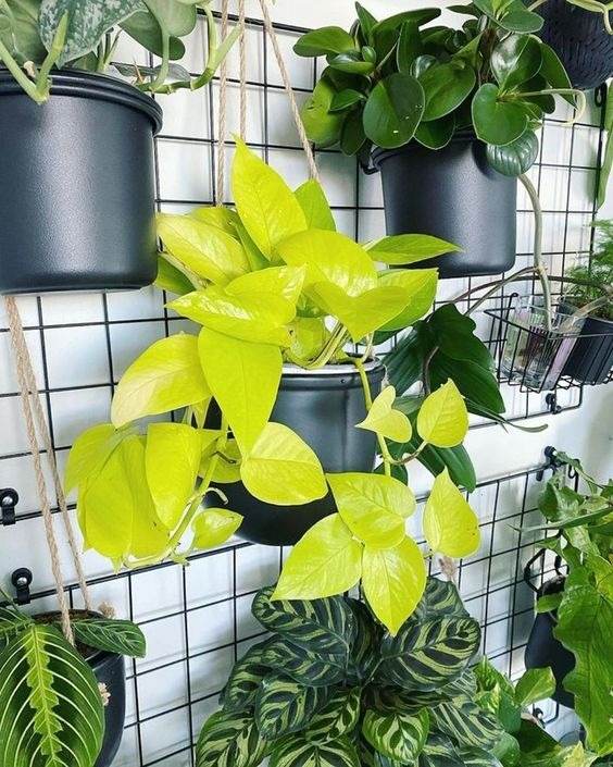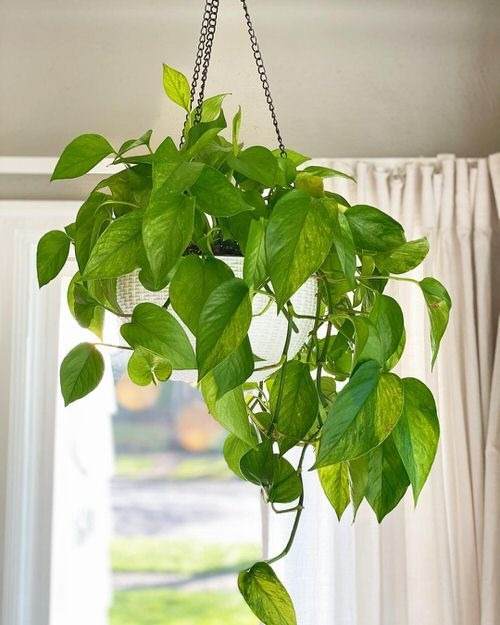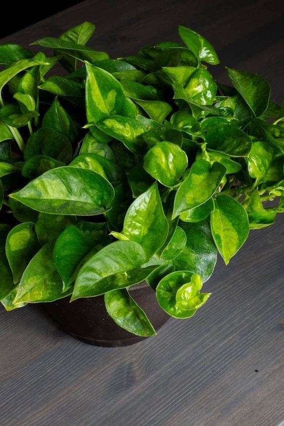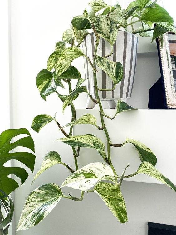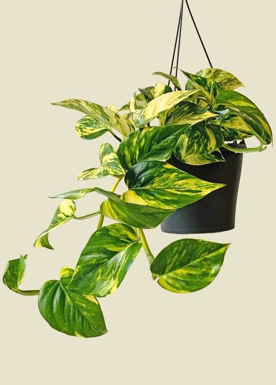 Golden pothos is a trailing vine with heart-shaped leaves that are variegated with yellow or white. It prefers bright, indirect light, but can survive in low-light conditions.