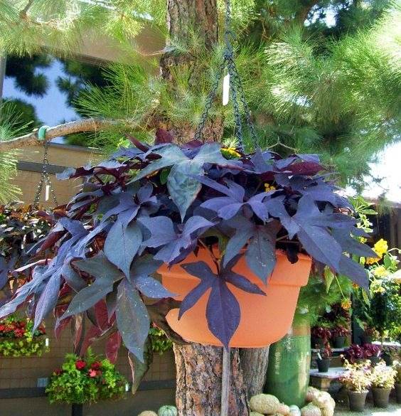 The sweet potato vine is a fast-growing annual and classic âspillerâ plant commonly used for container gardening. It has heart-shaped leaves that can be green, purple, or chartreuse, depending on the variety.