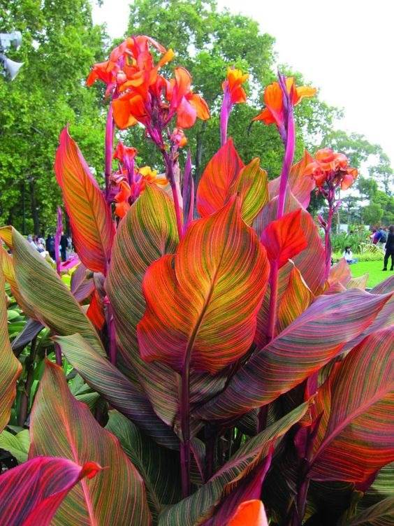 Cannas are stunning plants that have colorful, paddle-shaped leaves and showy flowers in various shades of yellow, orange, red, and pink. They can range in height from 1.5 to 10 feet, depending on the variety, and have large, oval or lance-shaped leaves that can be green, bronze, black, variegated, or striped.