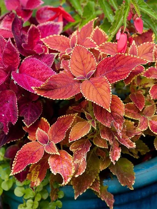 Coleus have square stems and opposite leaves that can be oval, lance-shaped, or lobed. The leaves are the main attraction of coleus, as they come in various shades of green, yellow, pink, red, purple, and black, often with contrasting veins or edges.