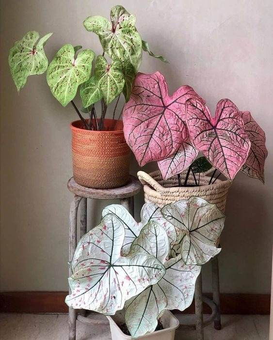 Caladiums are beautiful plants that have colorful, heart-shaped leaves in various shades of green, red, white, and pink. They thrive in indirect light or moderate shade and prefer rich, well-drained soil that retains moisture but does not become soggy.