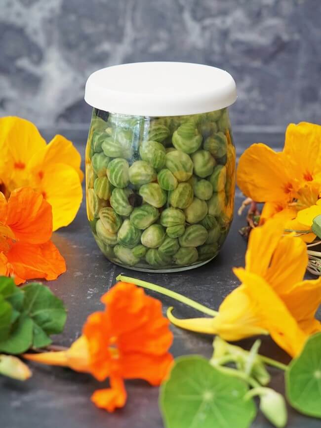 The seed pods of nasturtium are often used as a tasty replacement for capers. Harvest the green pods, pickle them in vinegar, and enjoy their sharp, tangy flavor. They re delicious on pasta, salads, or as a garnish for meats and fish.