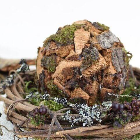 This rustic wood sphere adds a grounding, forest-inspired charm to any room. Start with a foam ball and glue small chunks of bark, moss, and dried wood pieces across the surface, layering them for a natural, textured effect.