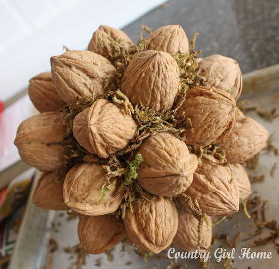 This walnut ball gives your home a warm, rustic accent that fits beautifully into autumn or holiday decor. Simply glue whole walnuts around a foam sphere, tucking bits of moss or dried grass in between to add a natural touch.