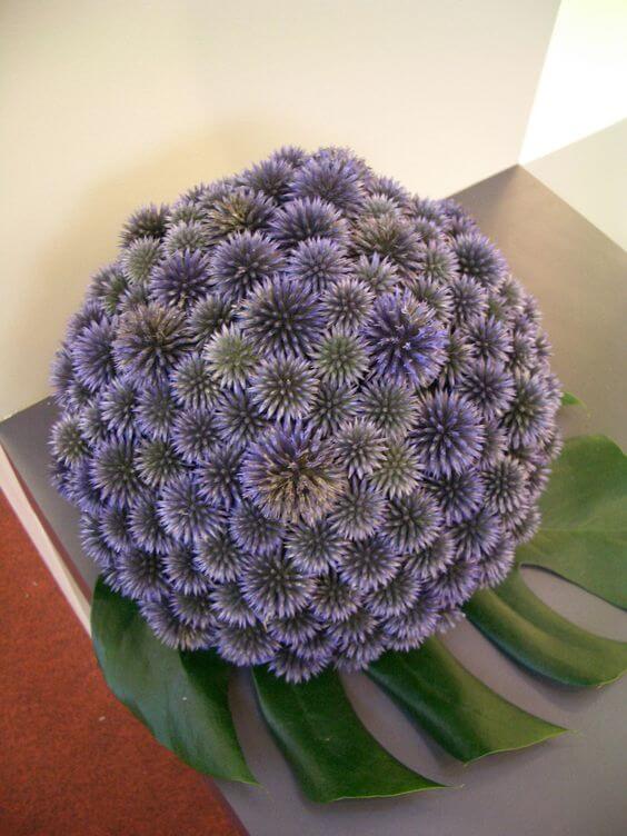 This striking fresh flower sphere looks like a blooming piece of art that brightens any table or corner. To recreate it, gather vibrant globe thistles or any small, sturdy blossoms in one color for a cohesive look.