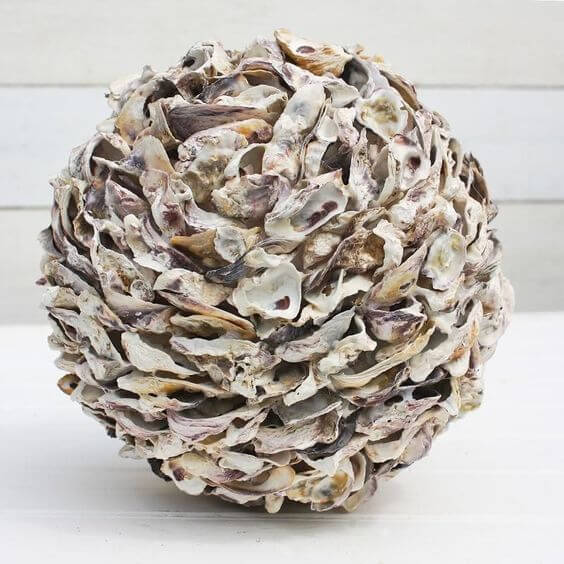 This seashell sphere captures the calm essence of the ocean and brings a coastal charm into your home. Start by collecting small, flat shells and glue them layer by layer onto a foam ball, overlapping slightly to create texture.