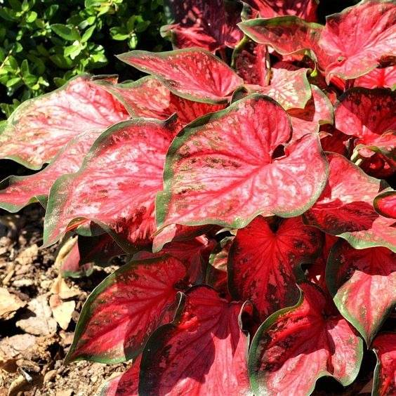Caladium comes in many varieties and cultivars, each with different shapes, sizes, and colors. One of the most attractive ones is varieties with red leaves, such as red flash, Candyland and Florida Cardinal.