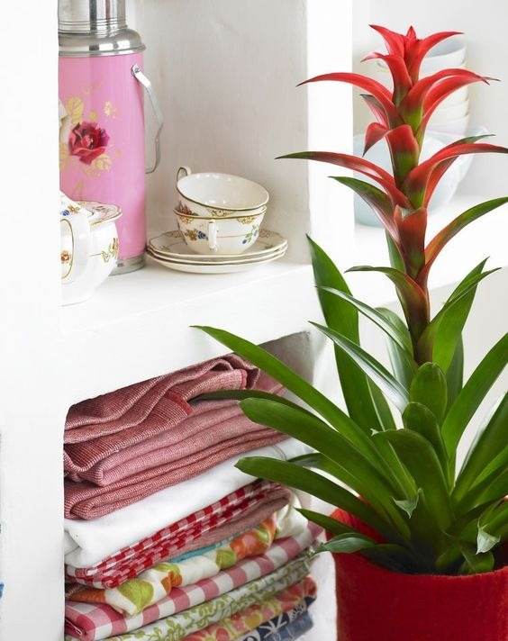 Bromeliad have rosettes of leaves that can be green, red, pink, or variegated. Some bromeliads produce colorful flowers that last for months.