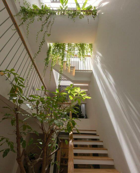 Source: ArchoskarThis staircase captures the essence of indoor nature in its purest form. A canopy of hanging plants spills gracefully from the upper floor, catching streams of natural light as they fall through the skylight.