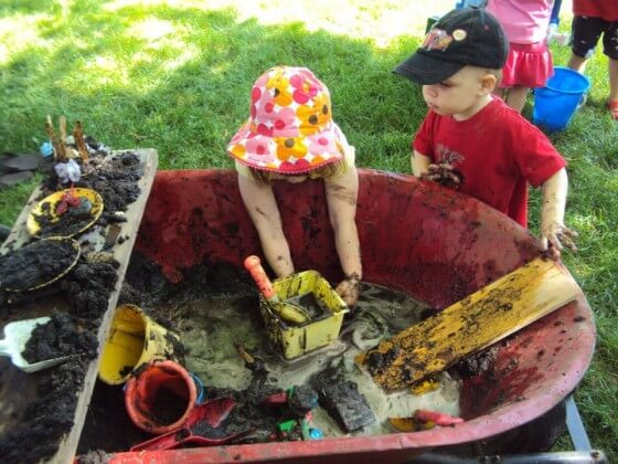 Turn a small wheelbarrow into a play station for kids. Fill one half with sand and the other with water. Add scoops, molds, and toy boats for fun.