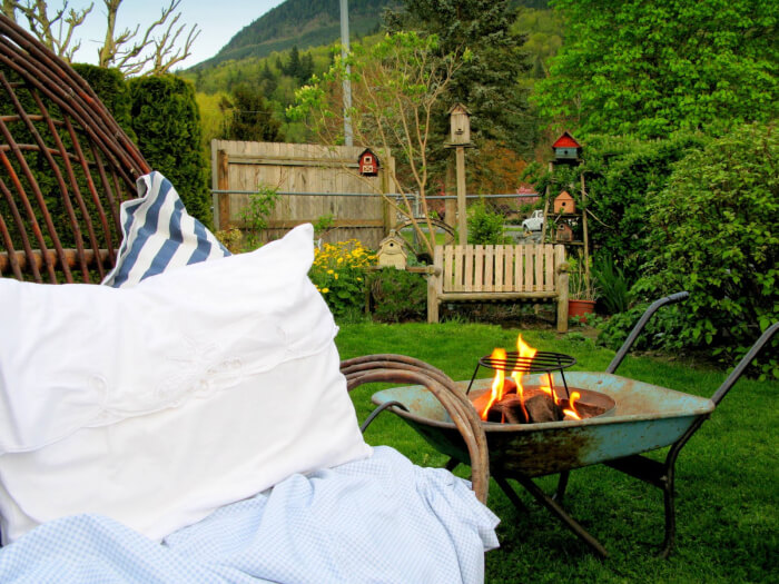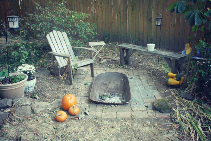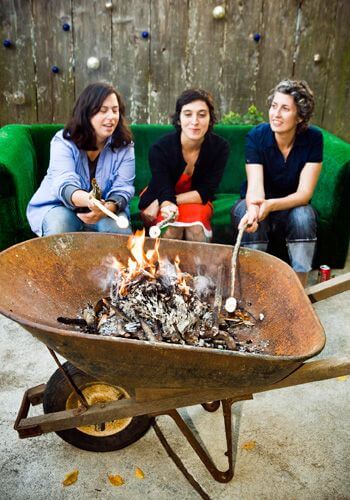 A sturdy metal wheelbarrow makes a cozy fire pit for gatherings. Line it with heat-resistant stones and fill it with wood or charcoal.