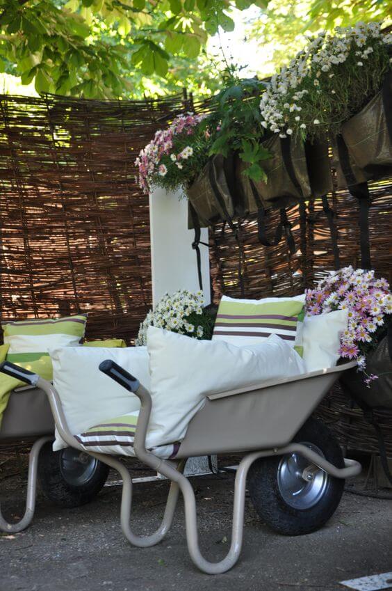 Source: PinterestCreate a romantic seating nook using a pair of wheelbarrows as the base. Add wooden planks or cushions to form benches.