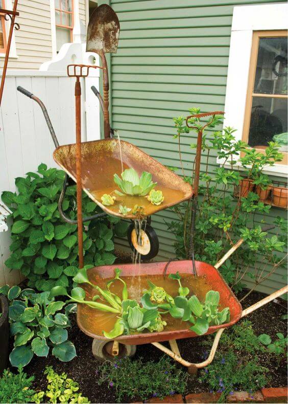Source: Carey Duncan BuenoKeep the rustic charm alive by turning an old, rusted wheelbarrow into a cascading water fountain. Install a small pump and let water flow over stacked stones.