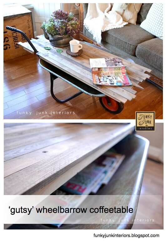 Repurpose your old wheelbarrow into a quirky outdoor coffee table. Clean it well and attach a wooden or glass top. You can store garden tools or magazines inside the basin.