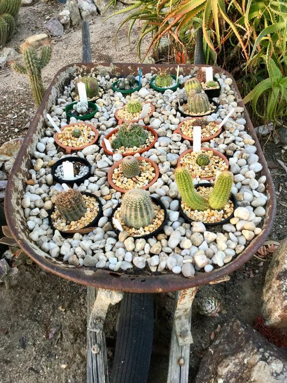 Source: Kath CarterA small, shallow wheelbarrow makes the perfect home for a desert-inspired cactus garden. Fill it with sandy soil and a mix of pebbles for drainage. Arrange different cactus varieties and succulents for visual contrast.