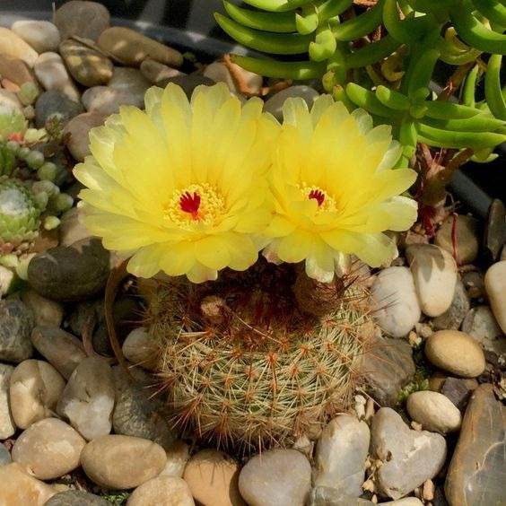 The Schlosser cactus has beautiful and bright yellow flowers that grow on top of a spherical cactus with coppery spines. It usually blooms in summer with a burgundy stigma in the center.