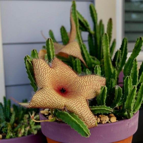 The Starfish Cactus is a type of succulent plant that has star-shaped flowers with a foul odor. The flowers are usually yellow or brown, and attract flies and other insects for pollination.