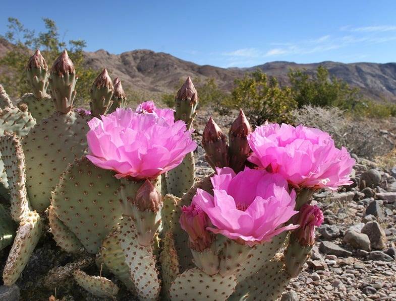 The beavertail cactus is a type of prickly pear cactus that has flat, fleshy pads that look like beaver tails. It has pink to rose colored flowers that bloom in spring or summer, and small, spineless fruits that are edible.