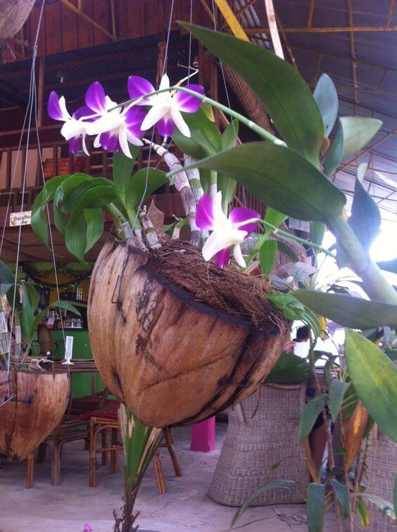 Coconut shells naturally allow airflow and drainage, making them ideal for epiphytic orchids. Simply fill the base with a bit of sphagnum moss or bark, then water lightly as needed.
