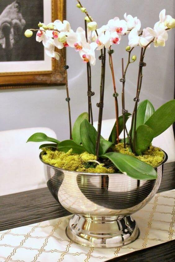 Who says orchids need to stay in basic pots? This design transforms a classic silver bowl into a chic indoor planter that instantly elevates your dining or coffee table.