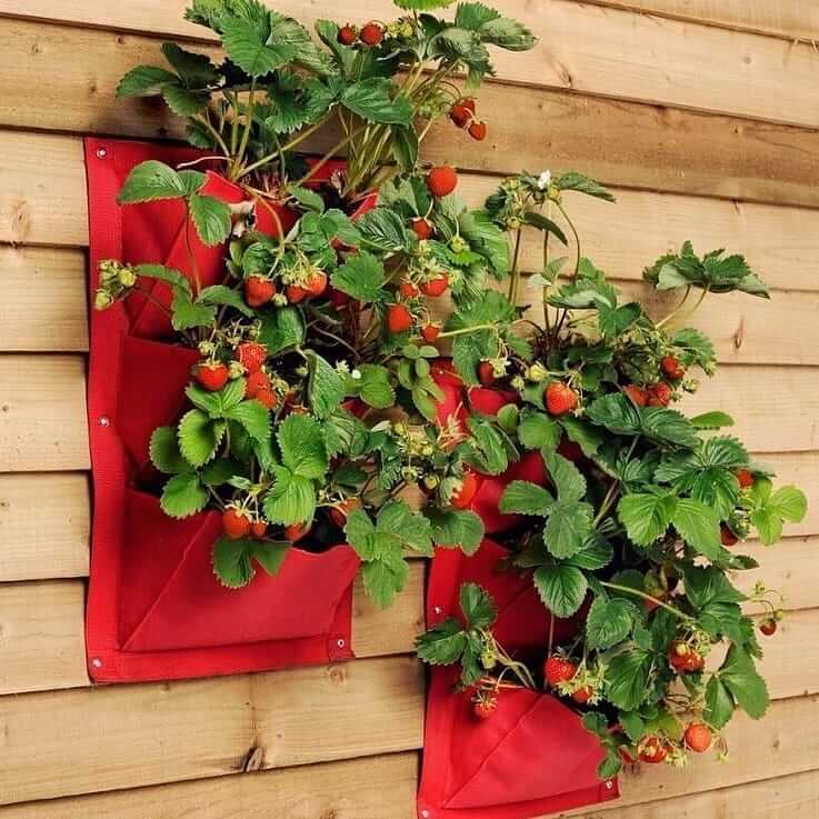 Fabric pocket planters are a game-changer for tight spaces and urban walls. Each stitched pouch cradles a strawberry plant, creating a living tapestry of vibrant green and red.