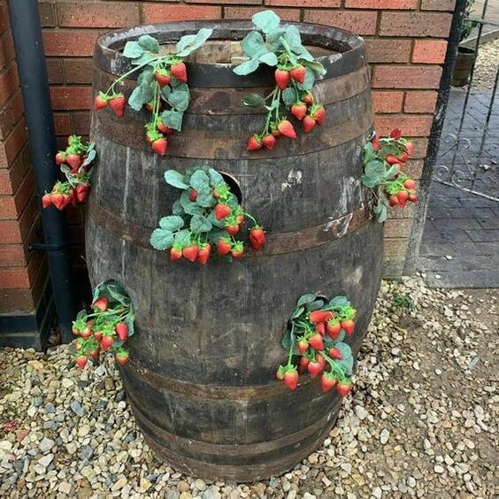 This rustic whiskey barrel planter makes strawberry growing both charming and efficient. With strategic cut-outs along the sides, it lets each plant spill over the edges in a cascading display of red fruit and green foliage.
