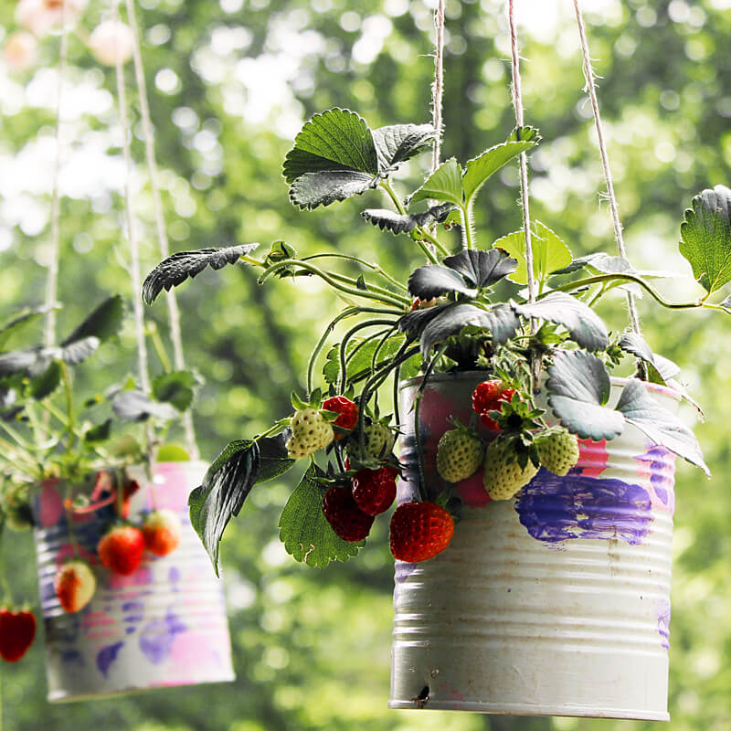 These playful hanging tin cans give your strawberries a fun and colorful new home. With just a few painted cans, some rope, and drainage holes, you can create an eye-catching vertical garden that sways gently in the breeze.