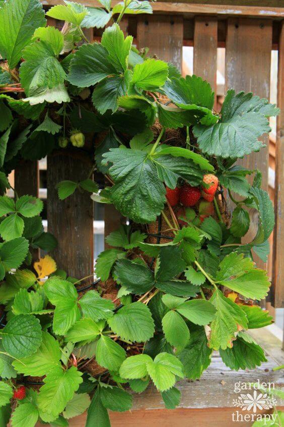 This wooden pallet planter is a rustic charmer and a practical garden solution in one. Its layered slats provide natural pockets for planting, giving strawberries plenty of room to sprawl and thrive.