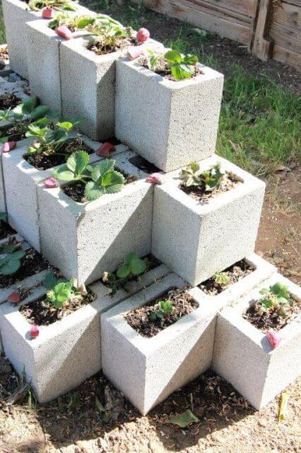 Cinder blocks stack neatly to form a geometric, tiered strawberry tower that feels bold and modern. Each hollow space becomes a pocket of soil, ready to nurture one or two berry plants.