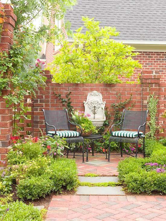 This cozy corner is perfect for quiet coffee mornings or afternoon chats. The brick walls provide privacy and warmth, while a vintage wall fountain adds an elegant focal point with its gentle trickling sound.