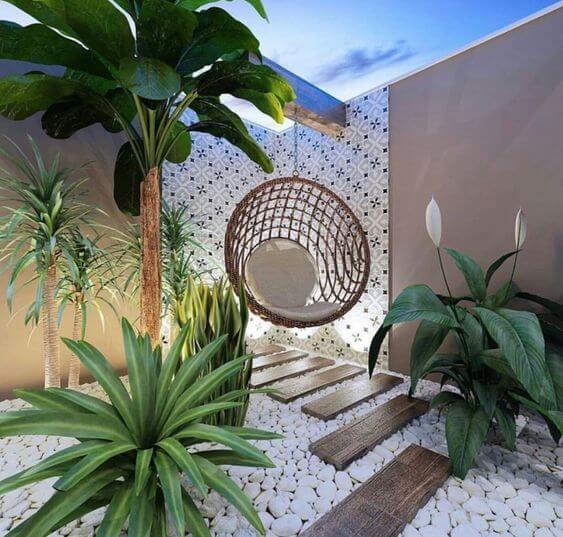 A cocoon-style hanging chair invites you to sink in and unwind, while the white pebbles and wooden stepping stones add a clean, calming contrast to the bold green foliage.