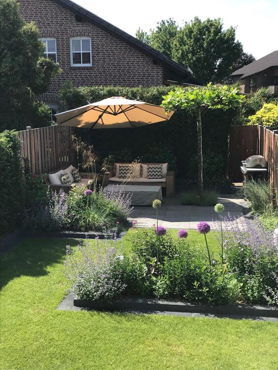 To create this look, install raised beds with sharp edges for a tidy finish. Add an outdoor umbrella and built-in seating to define your relaxation zone.