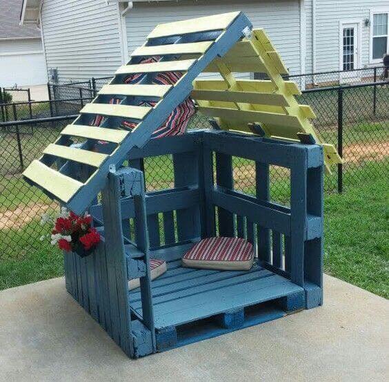 Use pallets to form the walls and floor, then build a small roof with more pallet boards. Paint it in bright colors to make it more fun.