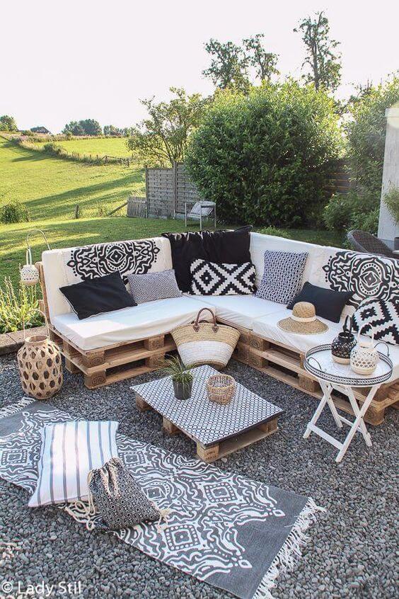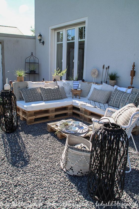 Stack pallets in a row to create benches, then place cushions and pillows on top. A pallet table in the middle ties the space together.