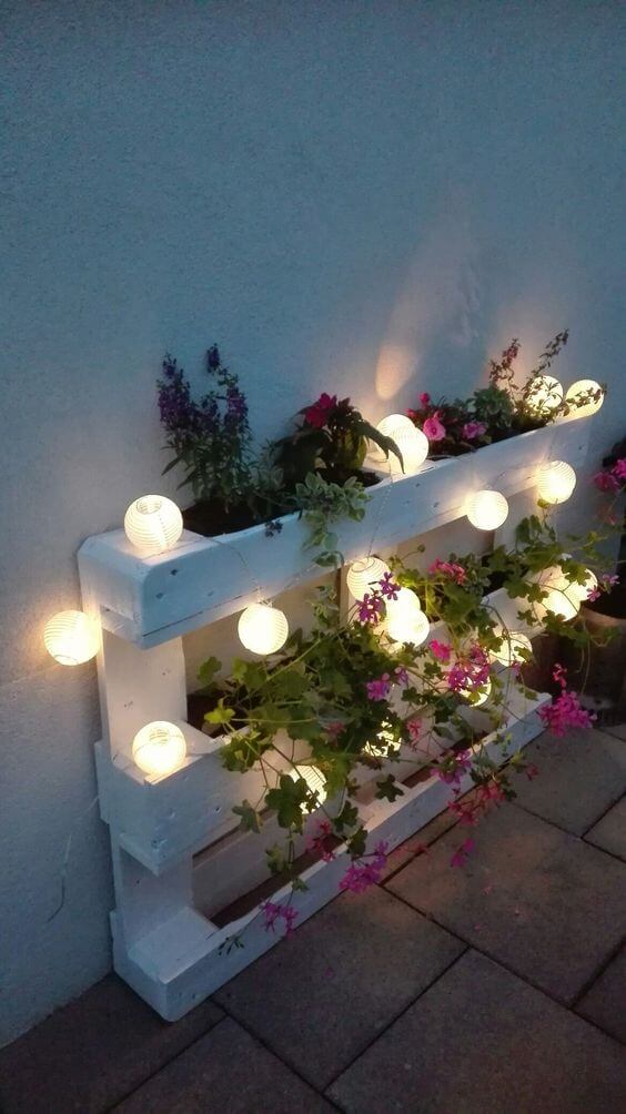 Set a pallet upright and tuck small pots or planters into the slats. String outdoor lights across the frame for a soft glow.