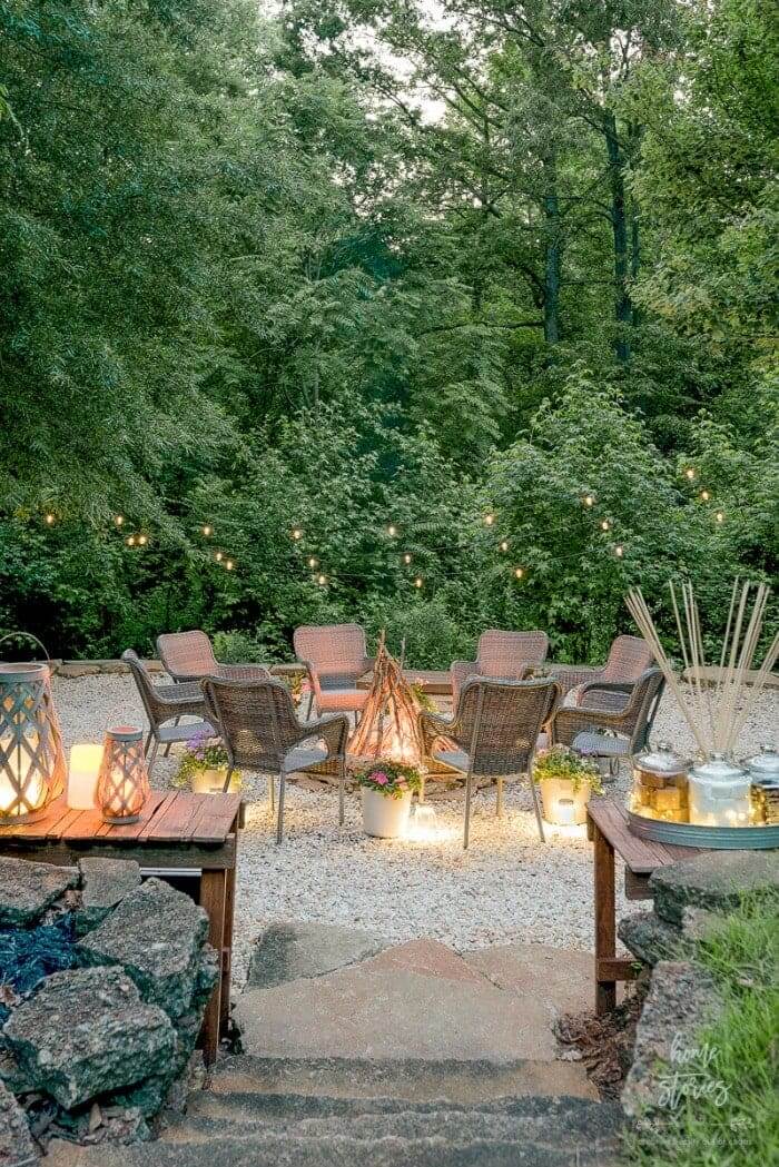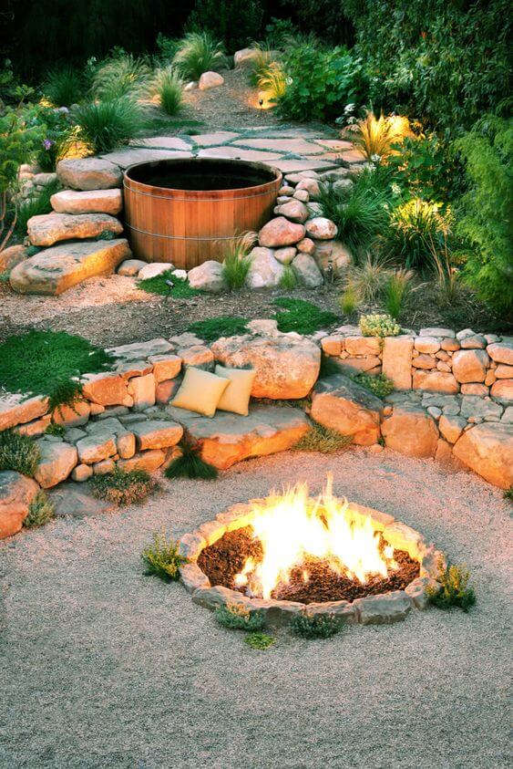 The rustic stone fire pit creates a cozy focal point, while the surrounding gravel adds texture and warmth to the space.