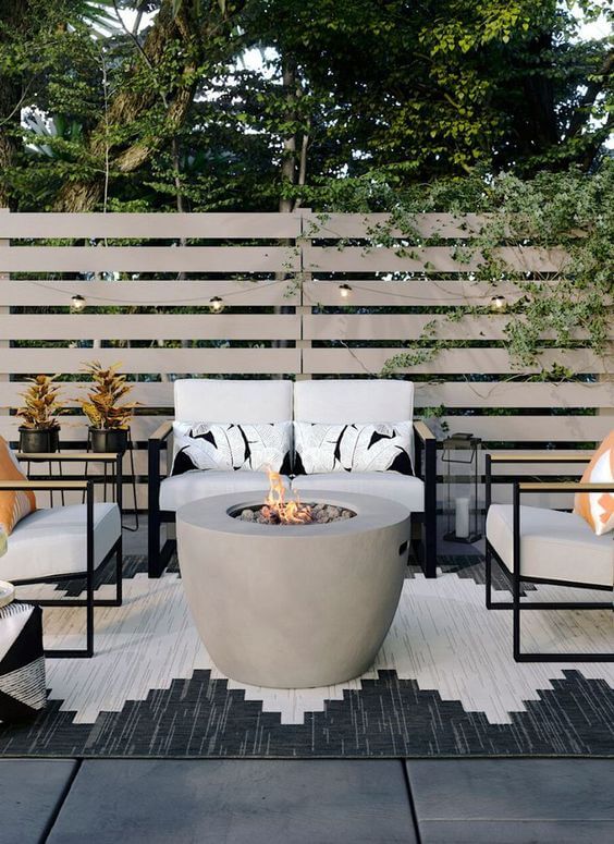 Image Credits: ClassicallycaitThese chic black planters perfectly frame the fire pit area, adding a pop of greenery to an otherwise minimalist space. With their sharp, clean lines, they complement the modern, industrial feel of the concrete fire bowl and sleek furniture.