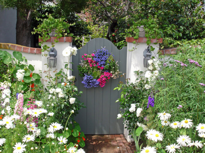 Source: SDnewsThis little gate instantly brightens the entire garden with a burst of cheerful color and charm. Painted in soft sage-gray, it stands confidently between two white stucco columns while a vivid flower wreath pulls you right in.