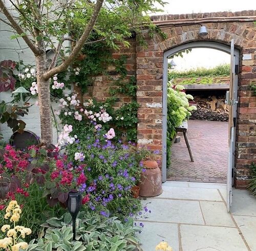 Source: InstagramThere s a lovely old-world feel to this scene: rustic brickwork, an iron gate swung open, and flowers spilling over like they re eager to greet a guest. The mix of climbing roses, violet geraniums, and red snapdragons softens the brick.