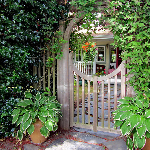 To recreate this look, choose a wooden gate with a soft arch and plant fast-growing climbers like clematis or honeysuckle nearby. Add two large hostas in terracotta pots for a lush, grounded entry.