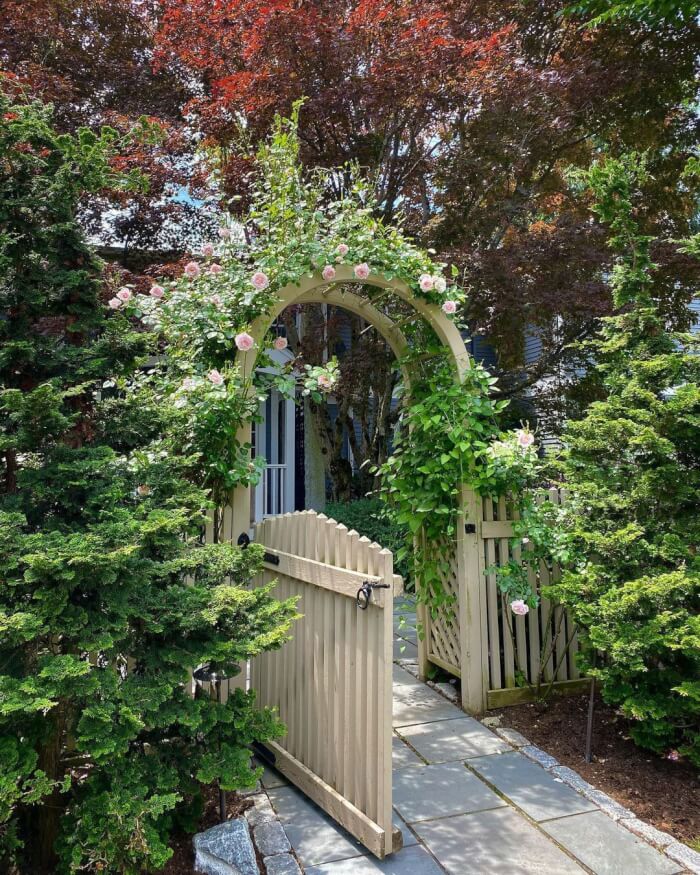 Source: InstagramThis creamy gate, with its gentle arch wrapped in pink rose vines, feels like a romantic invitation into a peaceful sanctuary. The slatted design keeps it charmingly casual, while the pathway framed by evergreens offers shade and balance.