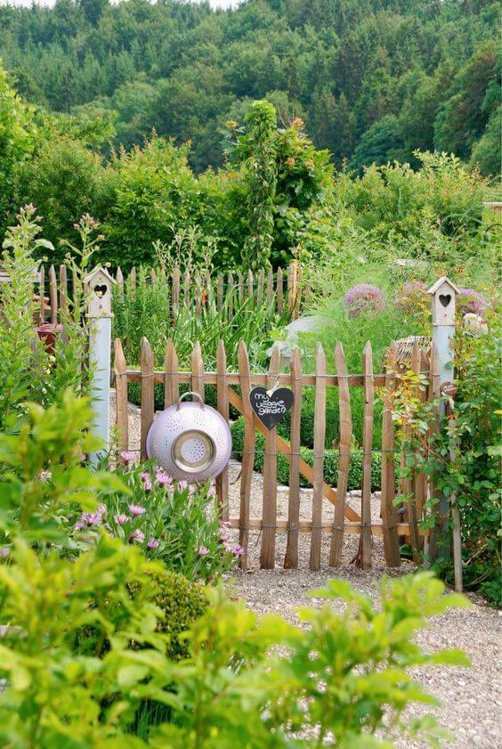 Source: TalesfromcarmelThis little wooden gate brings a handmade, welcoming feel to your garden entrance. It s framed by simple posts topped with heart cutouts and decorated with a hanging colander and a cute chalkboard sign reading âMy Veggie Garden.â