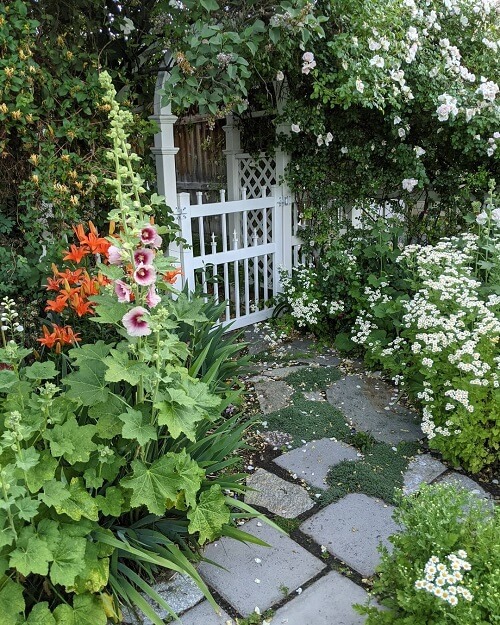 Source: InstagramThis crisp white gate framed by a charming arched trellis feels. Lush clusters of hollyhocks, lilies, and alyssum make the entrance pop with life and color, while the stone path is softened by moss and creeping thyme.