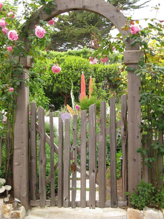 Source: WestwingnowThis charming gate keeps things simple but warm. The natural wood slats have a slightly uneven finish that gives them a handcrafted feel. A rounded arch frames the gate beautifully, with soft pink roses winding their way up the sides.