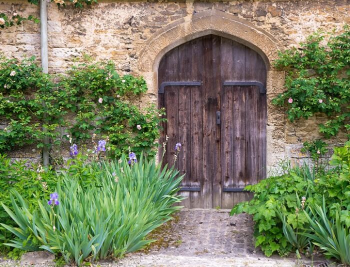 Source: CommunitysnapwireThis heavy wooden door, tucked beneath a pointed stone arch, feels like a portal into a forgotten story. Its deep texture and aged grain contrast beautifully with the climbing roses and tall irises brushing up against the walls.