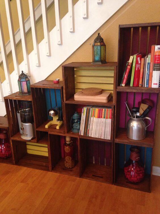 This colorful crate setup turns the unused space under your stairs into a lively storage nook. You can stack old wooden crates in different sizes to fit perfectly into the stairwell area.