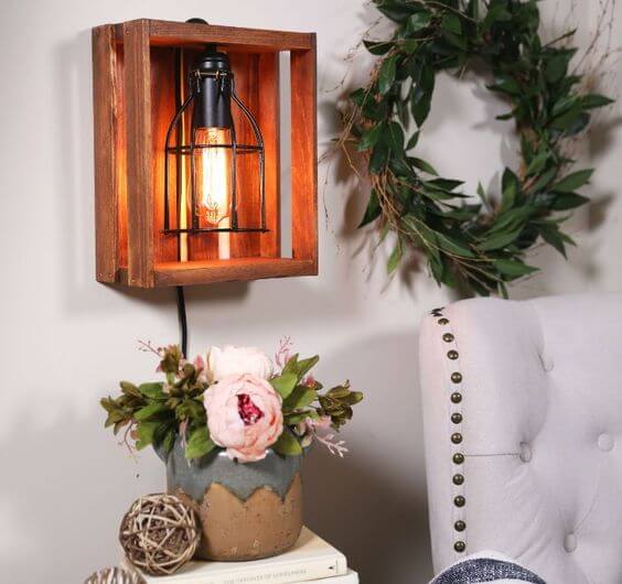 This DIY crate wall lamp brings a warm, rustic glow to your home. You can easily repurpose a small wooden crate into a light fixture by mounting it on the wall and fitting it with a vintage-style bulb.